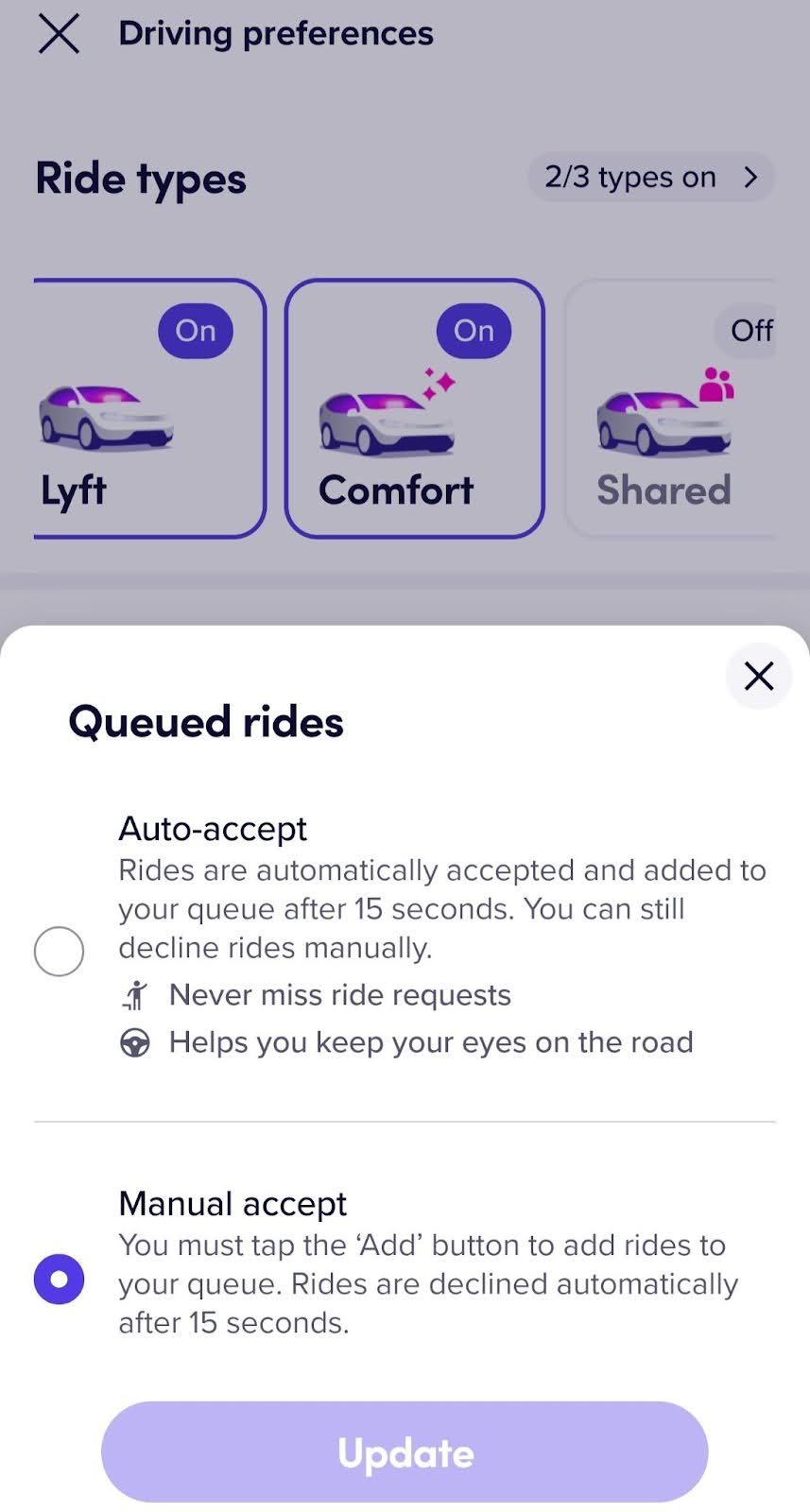 In addition, the Queued Rides feature now includes a “Manual Accept” option. While auto-acceptance remains the default to keep rides flowing, drivers can now review trip details and make a conscious decision about the next ride before their current one ends.